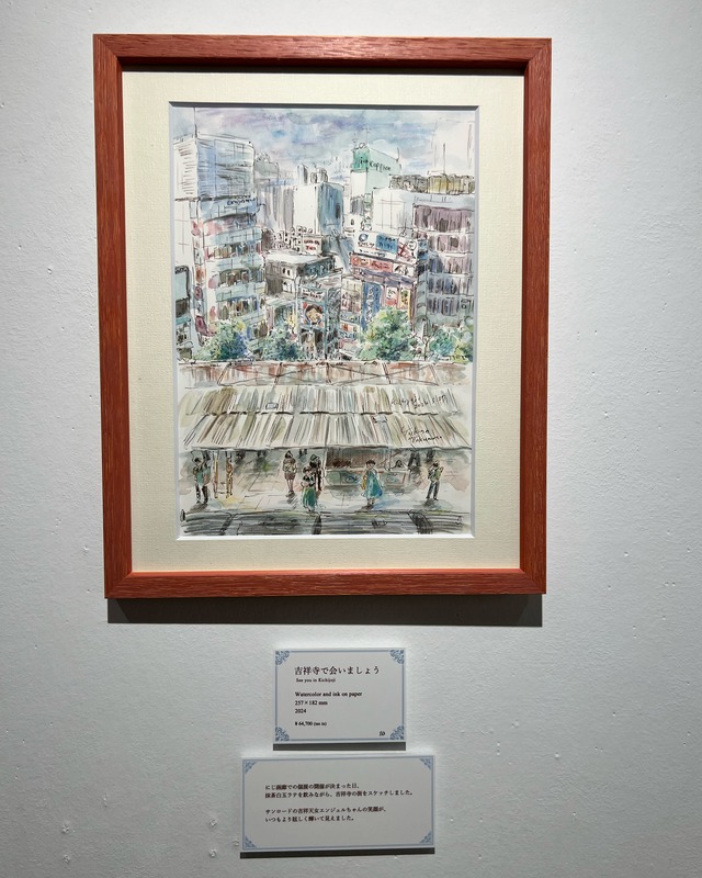 にじ画廊での個展の開催が決まった日、 抹茶白玉ラテを飲みながら、吉祥寺の街をスケッチしました。 サンロードの吉祥天女エンジェルちゃんの笑顔が、 いつもより眩しく輝いて見えました。 【作品情報】 原画(一点物) 縦257mmx横182mm (額縁:縦323mm×横260mm) Watercolor and ink on paper 2024年製作 【額装】 額縁込みのお値段となっております。 【送料について】 別途送料がかかります。送料には梱包費が含まれております。 【発送について】 一つ一つの作品を手作業で丁寧に梱包しお客様の元へお届けしている為、発送はご注文から一ヶ月ほどお時間をいただきます。到着をお楽しみにお待ちくださいませ。 ■Information on artwork Original painting 257mm x 182mm (frame: 323mm x 260mm) Watercolor and ink on paper Created in 2024 ■Frame Price includes frame. ■Shipping Additional shipping charges apply. International shipping is available too. Packaging costs are included in the shipping fee. ■Shipping date Each piece is carefully hand-packed and delivered to the customer, so it will take about a month from the time of order to ship. I hope you look forward to receiving your item.